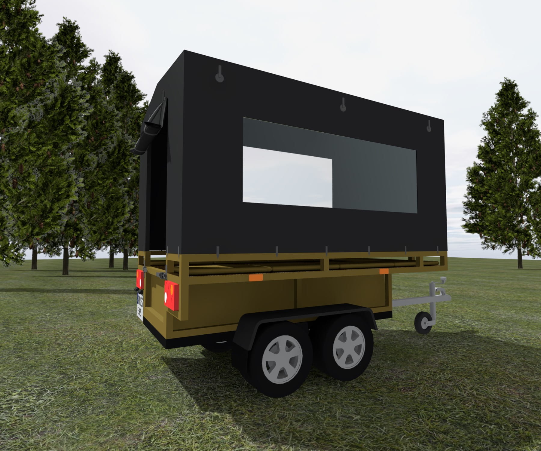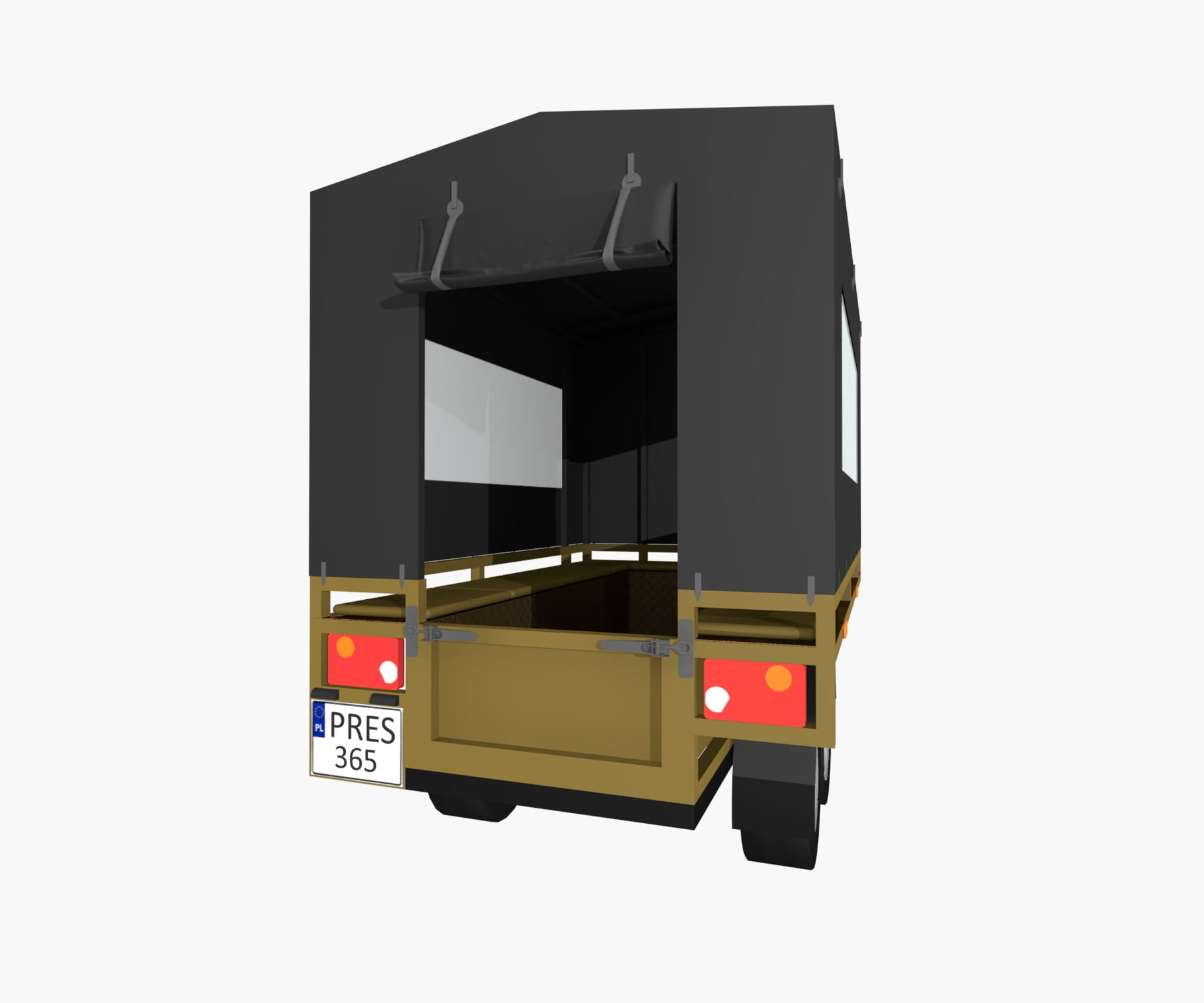 Plandeka posiada otwierane trzy boki ( dwa boczne + tylne z możliwością podwieszenia ) oraz przezroczyste okna boczne , przednie oraz tylne.