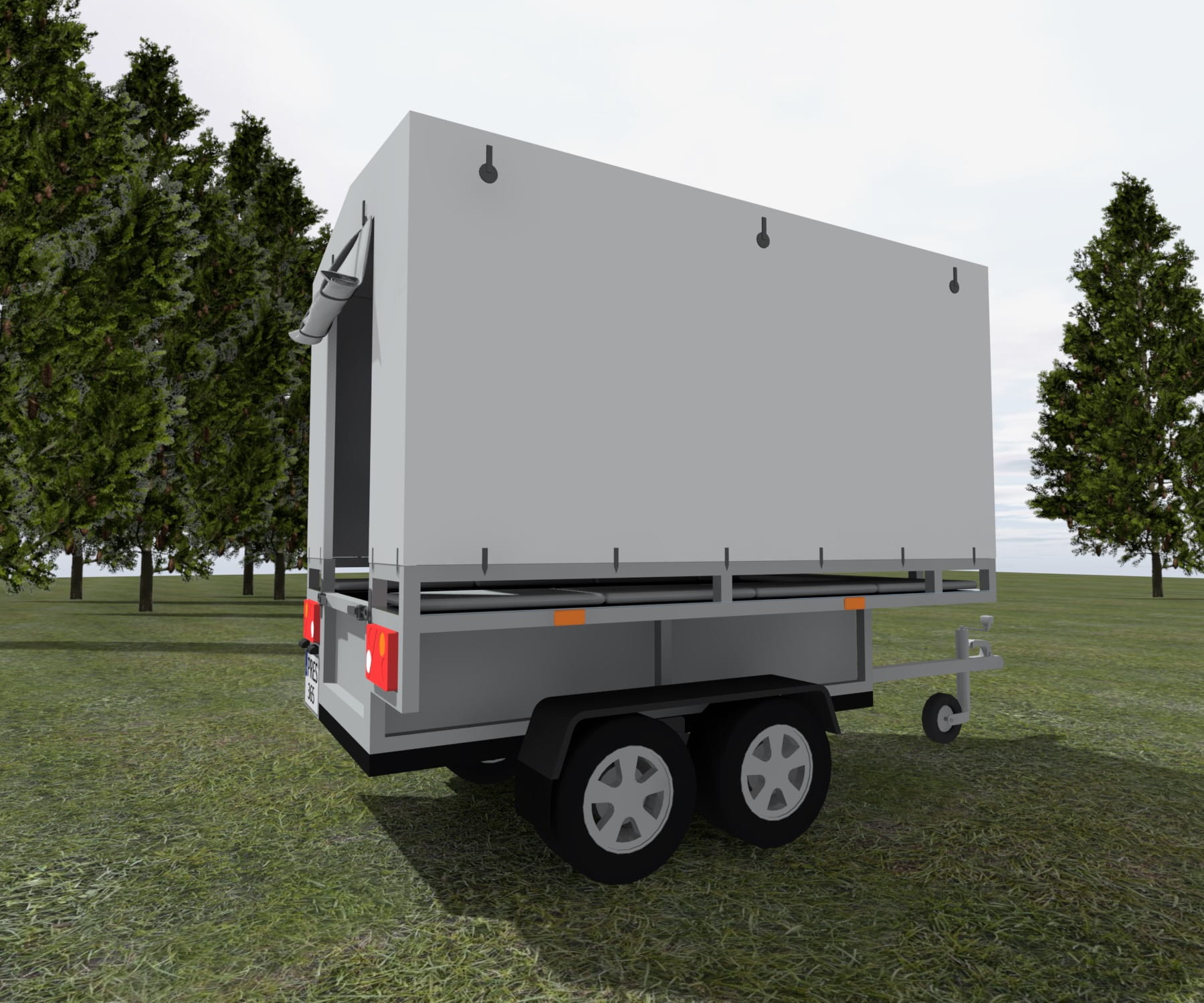 Przyczepka wyposażona w stelaż oraz plandekę, możliwość szybkiego demontażu stelaża łącznie z plandeką.